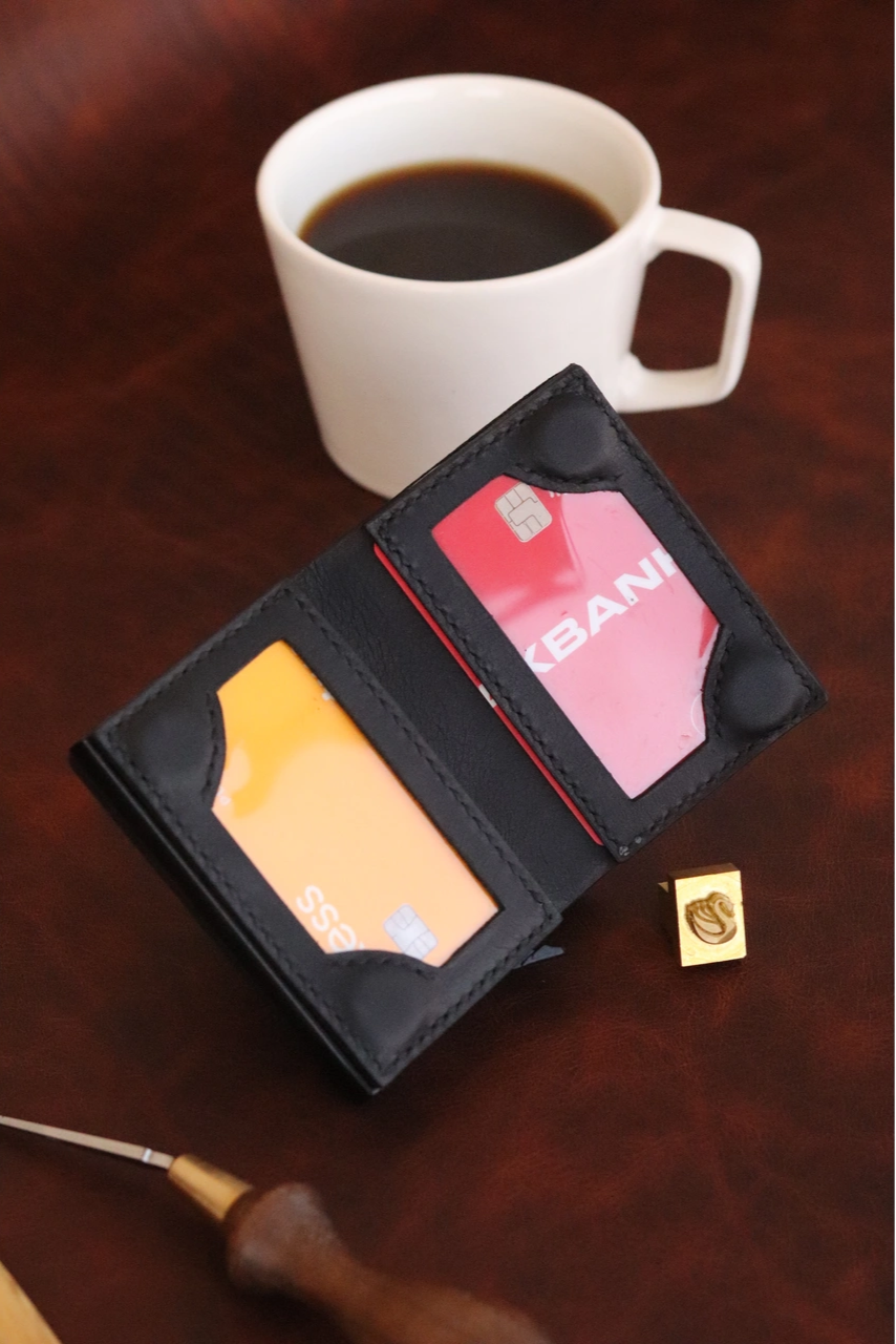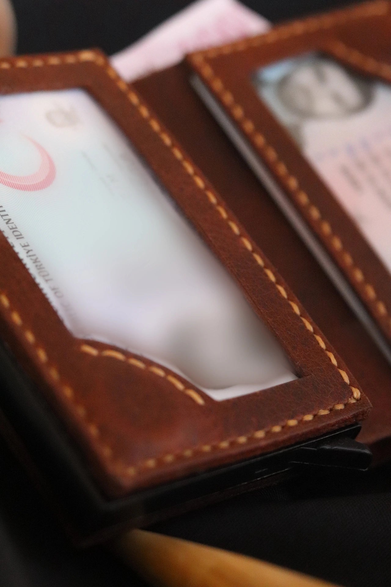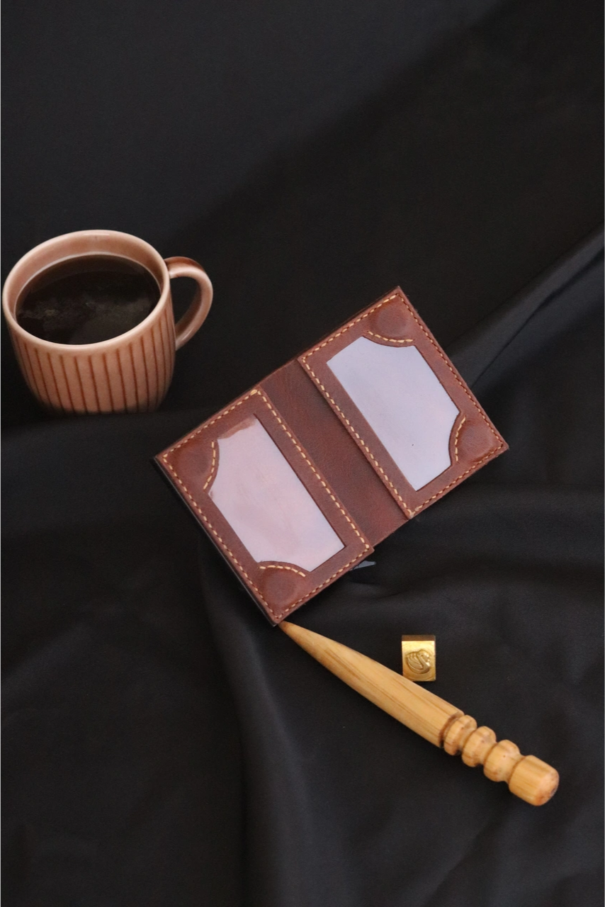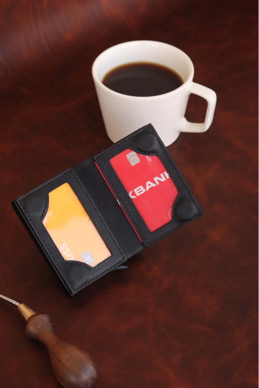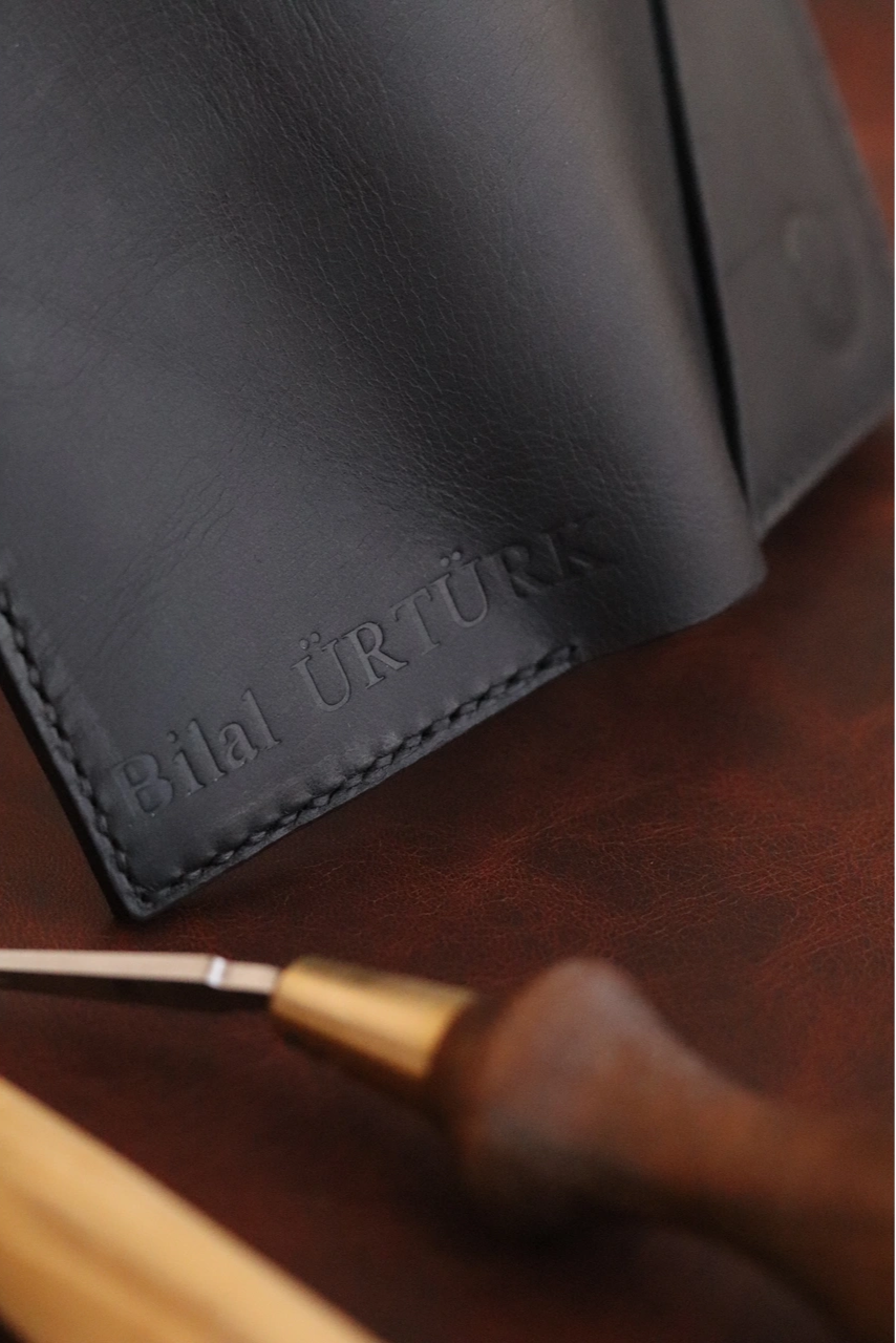 İç kısmında iki adet şeffaf pencere bölmesi bulunan bu model, sık kullandığınız kartlara hızlı erişim imkânı sunar. Dış kısmında ise hem kişiselleştirilmiş isim baskısı hem de zarif bir logo detayı yer alır. El işçiliğiyle özenle hazırlanmış kenar detayları ve sade çizgileriyle zamansız bir görünüm sunar.